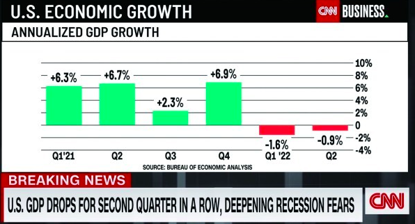 这是美国经济连续两个季度萎缩,标志着美国经济陷入“技术性衰退”。