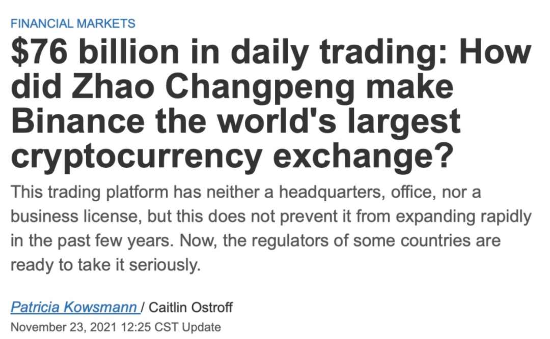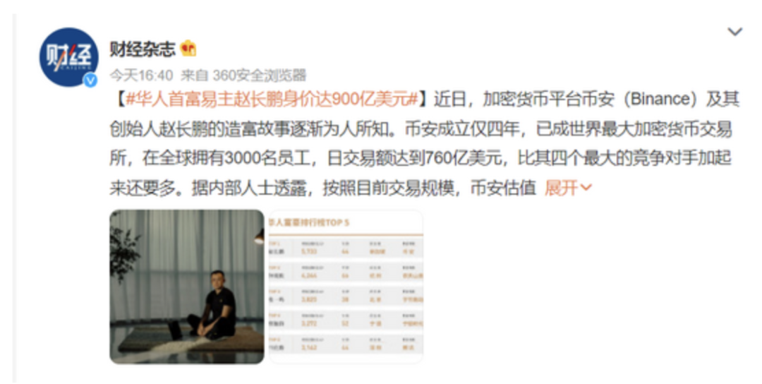 币圈风波又起,全球最大加密货币交易所币安遭起诉。 3月27日,美国商品期货交易委员会 (CFTC) 起诉币安。该公司及其创始人赵长鹏被控展开非法交易和虚假合规计划。 图源cnbc 版权属于原作者根据美国监管机构的说法,币安运行了一个“虚假”的合规计划。 CFTC 表示,从 2019 年 7 月至今,币安扩大并隐藏了其美国用户群,在未有合规性注册下,向美国客户提供期货、期权、掉期和杠杆零售商品合约。 图源Reuters 版权属于原作者CFTC 主席 Rostin Behnam 周二对 CNBC 表示:“这似乎是一个非常明显的逃税案例,我们需要积极介入并尽快采取行动,因为这是欺诈行为。” 据路透社报道,币安于 2017 年在上海成立,但与“一家位于开曼群岛的控股公司”一起运营,并且“从未透露其核心交易所的位置。 早在去年12月,币安就被报道因涉嫌违反刑事制裁和洗钱而受到美国司法部的调查,一些检察官认为他们有足够的证据起诉赵长鹏和其他高管。 而赵长鹏也在博客回应了本次风波⬇️ 图源binance 版权属于原作者他表示:“CFTC提交了一份出乎意料和令人失望的民事投诉。经初步审查,该投诉似乎包含了对事实的不完整叙述,而且我们不同意对投诉中指控的许多问题的定性。” 关于赵长鹏赵长鹏是个白手起家的程序员。 1977年,他出生于中国江苏;1980年代晚期,赵长鹏和全家一起移民加拿大温哥华,并在蒙特利尔的麦吉尔大学(McGill University)完成了计算机科学学位。 之后,他在东京、纽约和上海都生活工作过一段时间,还为华尔街的量化交易者建立高频交易系统。 图源网络,版权属于原作者2013年,他开始瞄准加密货币,曾在Blockchain.info工作和担任OKCoin的首席技术官。 2014年,他卖掉了上海的房子,全仓投入比特币。 2017年,赵长鹏离开OKCoin,成立自己的公司币安并担任首席执行官。2017年7月,在首次代币发行中融资1,500万美元。 在不到八个月的时间,币安成为全球最大的加密货币交易所。 图源forbes,版权属于原作者2018年2月,《福布斯杂志》将他列为“加密货币首富”。2018年5月,其身价超过13.9亿美元。 此后,币安估值达到925亿美元,跻身私有科技企业的领先阵营,一度与字节跳动、支付巨头Stripe,以及SpaceX并驾齐驱。 2021年,赵长鹏以超过900亿美元的身价排名中国富豪榜首。 图源微博 版权属于原作者这也是属于赵长鹏最高光的时刻。 超过了曾经榜单第一名的农夫山泉董事长钟睒睒,同时也超过了字节跳动张一鸣,宁德时代曾毓群和腾讯马化腾。 阿里巴巴马云则被挤出了前5的榜单,以第6名落榜。 图源新浪财经 版权属于原作者在2021年,根据华尔街日报的新闻,币安交易所的每日交易额就达到了760亿美元。通过收取手续费、上币费、服务费等,币安赚的盆满钵满。 而且币安在全世界拥有9000万用户,上线了600多种数字货币,并提供24小时不间断的交易。 图源WSJ 版权属于原作者不过在2022年,赵长鹏曾在推特发过推文,说自己“返贫”了。 图源Twitter 版权属于原作者去年12月消息,福布斯估计,自3月以来,赵长鹏的个人资产缩水幅度最大,其净资产从3月的650亿美元下跌93.07%,降至45亿美元。 不过赵长鹏回应称《福布斯》统计并不准确。 赵长鹏与FTX赵长鹏与FTX的CEO SBF在3年前曾是盟友。 币安也曾对FTX进行过战略投资,帮助FTX在2年内估值从1亿美元飙涨至180亿美元。 后因公司业务产生了竞争关系,2021年7月赵长鹏将币安从FTX的股权投资中完全退出,从此分道扬镳。 FTX的破产对币圈来说,无疑是地震。 然而现在,赵长鹏与币安也身陷美国的对其的调查和起诉中。 作为全球最大加密货币交易所币,币安影响力自然比FTX大得多。而CFTC的诉讼对币安和整个币圈来说,肯定不是什么好消息。
