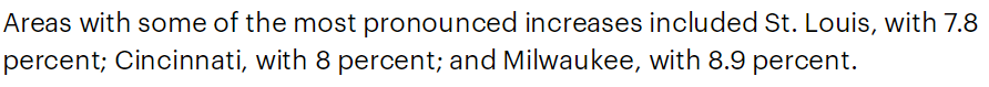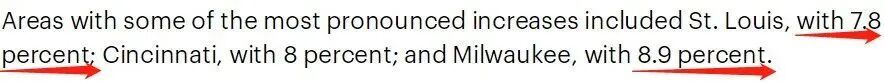 而且,虽然全美房价中位数有所下跌,但仍㓟部分城市房价在上涨。根据联邦数据,自疫情以来,不少人“涌入”这些城市,带动了房产价值。其中增长最明显的包括圣路易斯(St. Louis),增长7.8%;辛辛那提(Cincinnati),增长8%,以及密尔沃基(Milwaukee),增长8.9%。 数据来源于dailymail.com。