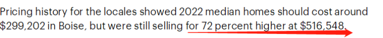 同样为“新兴”城市之一的爱达荷州博伊西(Boise),房价同期百分比下降与德州首府的几乎相同,房价中位数都在50万美元左右。博伊西(Boise)在2022年的房价房价中位数应在299,202美元左右,但现在仍高出最低房价72%,为516,548美元。 数据来源于dailymail.com。