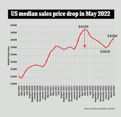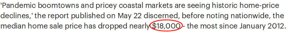 5月22日最新报告指出,全美范围内的房价中位数下跌了近18,000美元,为2012年1月以来的最大跌幅。
