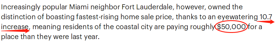 佛州迈阿密(Miami)邻近城市劳德代尔堡(Fort Lauderdale)房价房价中位数上涨了约10.7%,这意味着这座沿海城市的居民拥有房屋价格比去年同比高出约5万美元。 数据来源于dailymail.com。