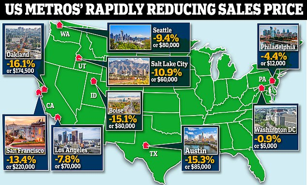 房价下跌的趋势在一些城市尤为明显,已有部分城市的房产中位数比一年前低了数十万美元。