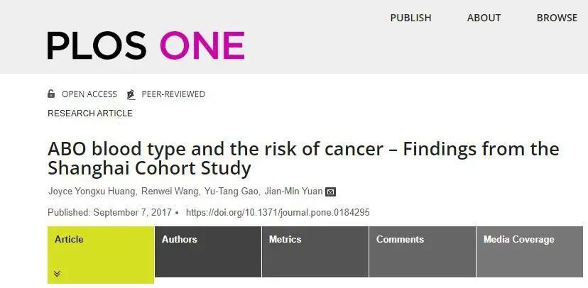 除了血型和疾病的关联,血型和癌症之间是否存在关系?对此,我国上海交通大学袁剑敏等学者也做过一项长达25年的追踪研究,并发表在《公共科学图书馆·综合》(PLoS One)期刊上。