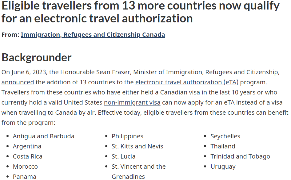 摩洛哥 巴拿马 安提瓜和巴布达 圣基茨和尼维斯 圣卢西亚 圣文森特和格林纳丁斯 特立尼达和多巴哥 阿根廷 哥斯达黎加 乌拉圭 塞舌尔 泰国 移民部长Sean在一份声明中说:“这一令人兴奋的发展意味着,来自世界各地的更多人现在可以开始难忘的冒险,探索我们多样化的景观,与家人和朋友团聚,沉浸在我们充满活力的文化中,而无需签证要求的障碍。 此次名单的扩大不仅为旅客提供了便利,还将增加旅行、旅游业和经济效益,并加强与这13个国家的全球联系。” 就目前而言,这13个国家已被加入到另外50多个国家的名单中,只要游客在过去10年里持有加拿大签证或目前持有有效的美国非移民签证,他们就可以免签并获得电子旅行授权(eTA)资格。 而eTA电子旅行证是一项预检入境要求,与旅行者的护照挂钩,有效期为5年,允许人们随时进入加拿大进行短期停留。 根据政府发布的消息,eTA申请也会在几分钟内自动获得批准。