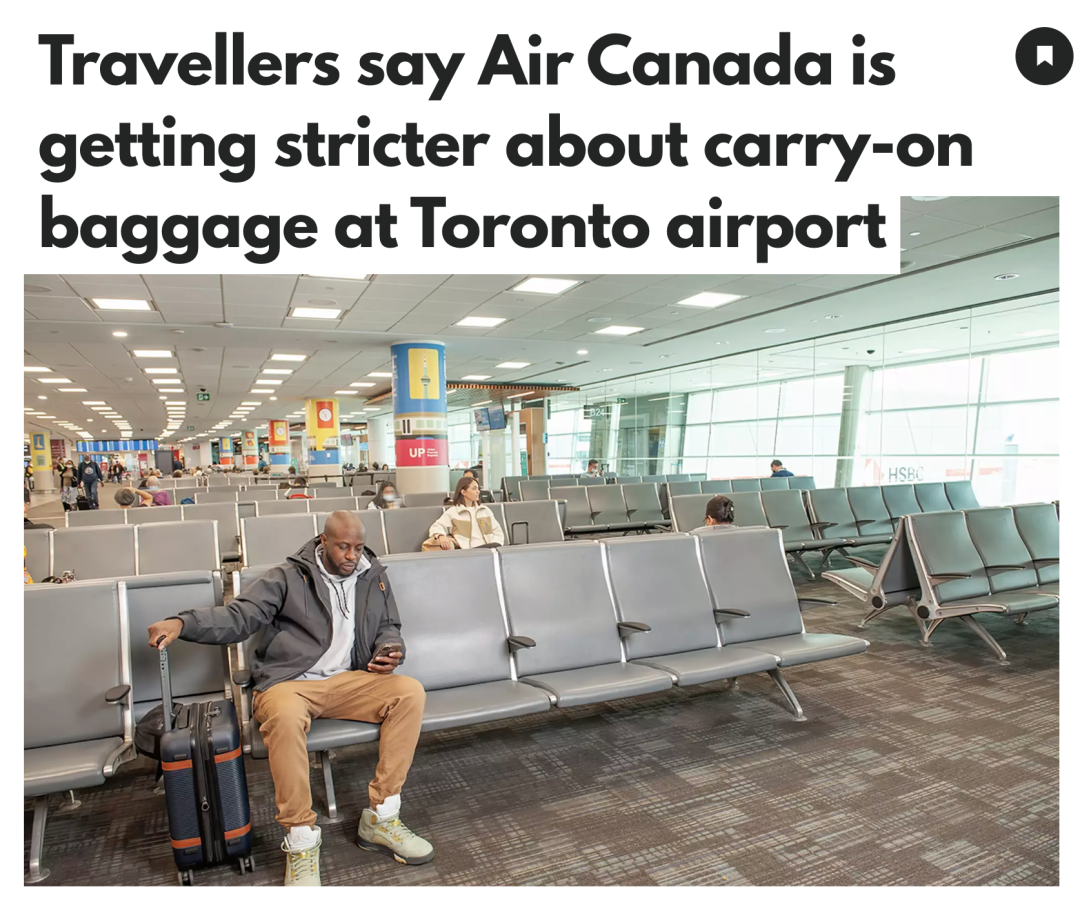 一名旅客周四在 YYZ 提到“人们完全崩溃”,因为他们不允许携带非常明显超大的行李箱和手提箱,或者必须付钱。