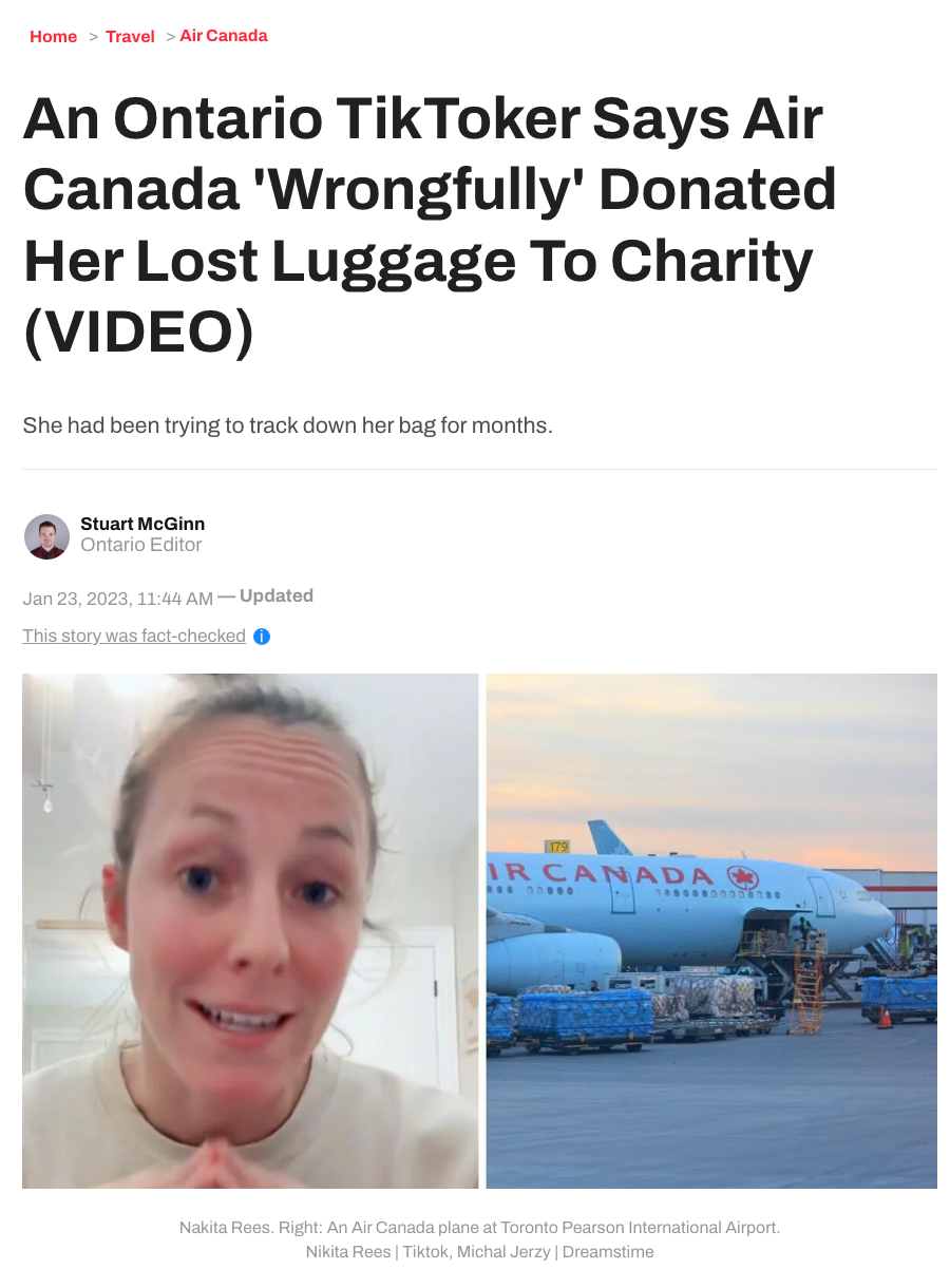 Nakita 说,她一直无法找到一项规定,如果行李丢失一定时间,加拿大航空公司可以合法地捐赠她的行李。