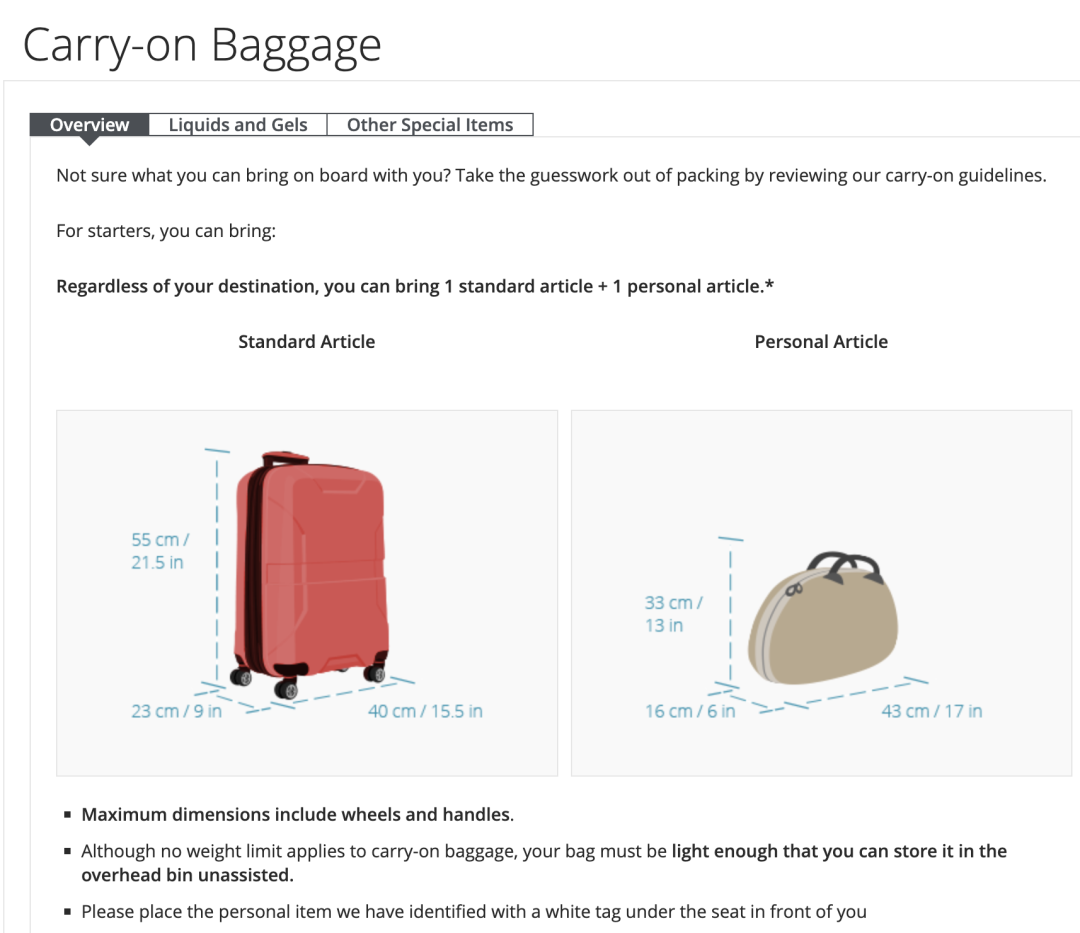 加拿大航空公司的政策规定,对于随身带入机舱的物品,其尺寸不得超过 55 厘米 x 40 厘米 x 23 厘米,包括轮子和把手。您还可以携带额外的个人物品,例如钱包或背包,只要不超过 33 厘米 x 43 厘米 x 16 厘米即可。 个人物品必须放在您前面的座位下,而随身携带的行李必须足够轻,以便您可以在没有任何帮助的情况下将它们存放在头顶行李箱中。
