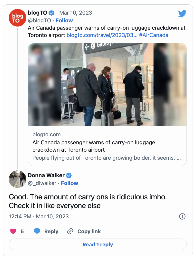 一位网友在 Twitter 上写道:“在这一点上,我支持加航的做法” 今年3 月份,有人上传了一段 TikTok 视频,建议其他乘客在出发前确保他们的包足够小,可以作为随身行李。