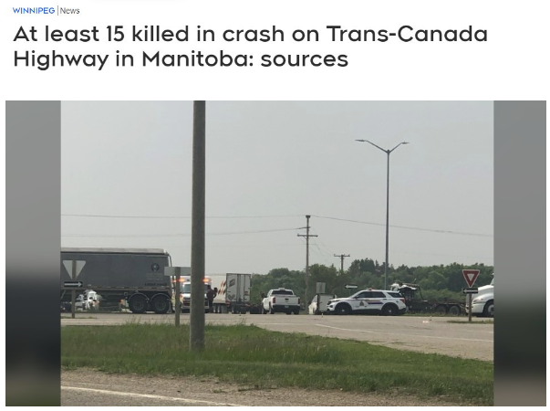 周四下午,加拿大曼尼托巴省Trans-Canada Highway高速发生一起重大车祸,一辆半挂卡车和一辆Handi-Transit车辆发生严重碰撞。有消息透露,至少15人在事故中丧生。