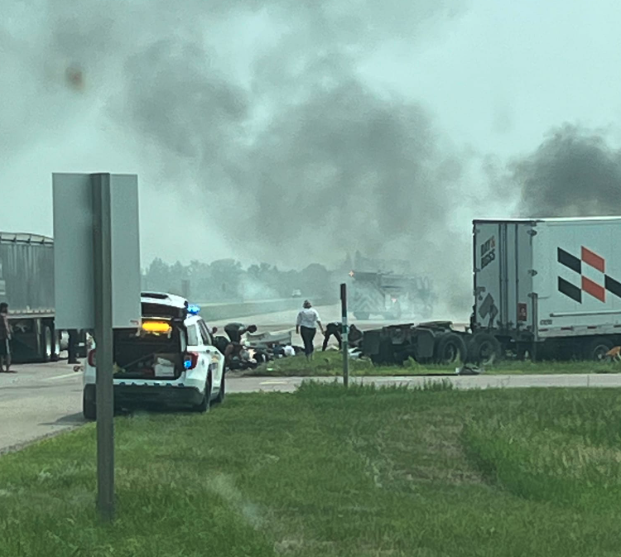 接着她在现场看到一辆半挂式卡车(semi truck )前端已经变形并正在冒烟,另一辆汽车严重受损。