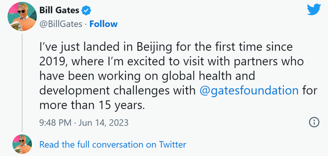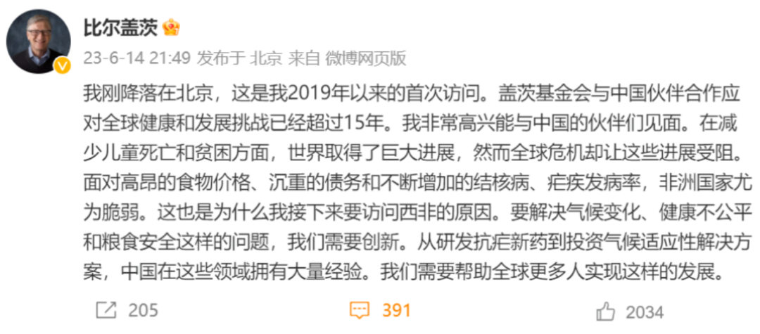 6月14日,微软联合创始人、比尔及梅琳达•盖茨基金会联席主席比尔·盖茨(Bill Gates)发推表示,自己已经抵达北京。 盖茨称,这也是他2019年以来首次到访北京,很高兴能与盖茨基金会一同应对全球健康和发展挑战的合作伙伴会面。 随后,比尔·盖茨也在微博上发文表示:“我刚降落在北京,这是我2019年以来的首次访问。