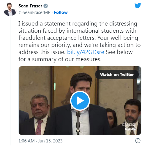 对此,Sean在一份声明中说:“我理解这种情况对那些受到欺诈的人来说是痛苦的,我想向他们保证,他们的权益至关重要。 我想明确表示,没有被发现涉及欺诈的国际学生将不会被驱逐出境。 我们正在利用一切机会打击那些不诚实和欺诈性的顾问,他们试图滥用加拿大的移民制度,利用那些寻求在加拿大访问、工作、学习或定居的人。 我们认识到国际学生对我们国家做出的巨大贡献,我们将致力于为学生提供一条诚实、透明的加拿大之路。”