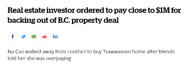 最近,BC省最高法院审理了一起发生在2016年的房屋购买违约案,一对华人夫妇因为毁约而被判赔100万加元!
