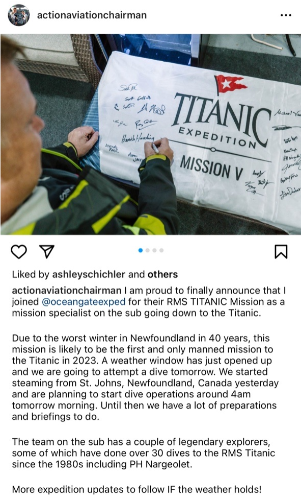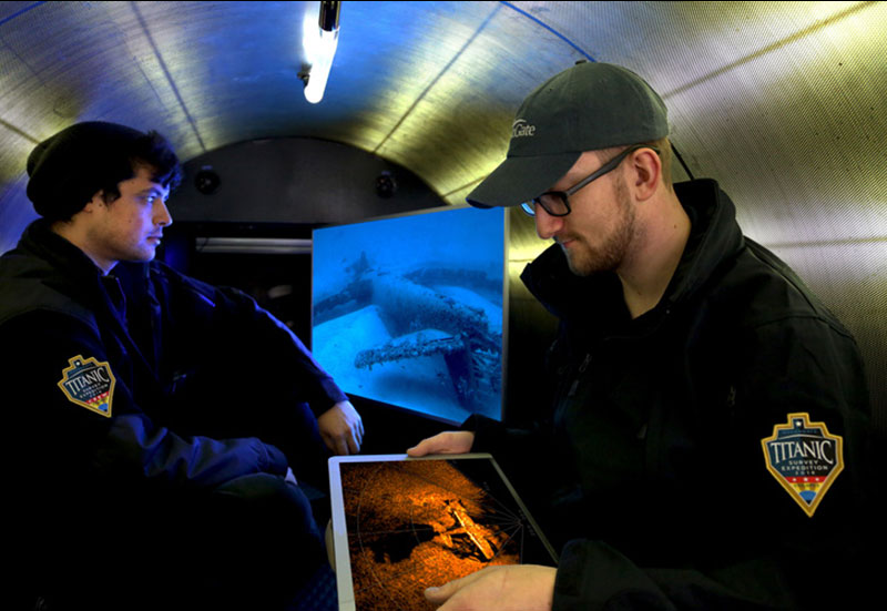 他们先是跟潜艇一起搭乘加拿大轮船北极王子号(Polar Prince)来到泰坦尼克号沉没的海域,然后母船放下潜艇,开始这次的探险活动。