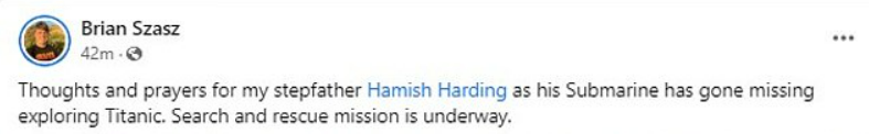 Hamish Harding的继子在Facebook上发文说哈丁在潜水艇上失踪,并请求大家为他们祈祷; 美国一位泰坦尼克号粉丝William Oakes表示,自己有朋友和熟人参加了这次探险活动,现在请大家为他们祈祷。