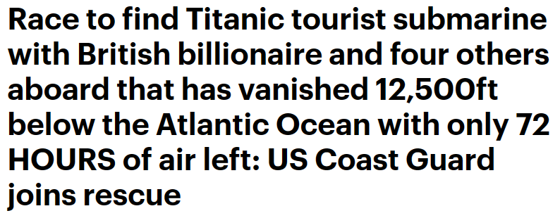 一艘由加拿大出发进行泰坦尼克号探险观光活动的小型潜艇失联,乘客凶多吉少。