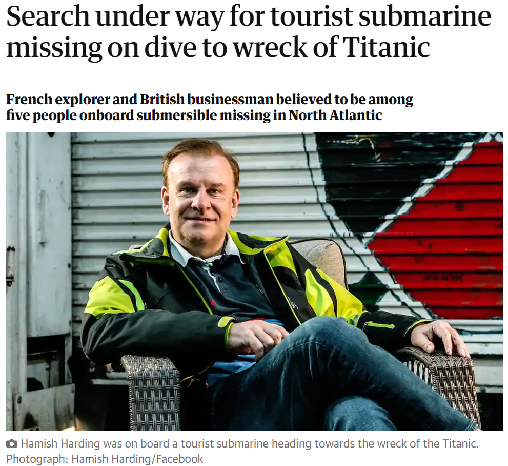 参加这种探险旅游项目的付费乘客非富即贵。失联的乘客中就有一名英国的亿万富翁,58岁的Hamish Harding。此人之前还曾经搭乘贝索斯的蓝色起源火箭进入过太空。
