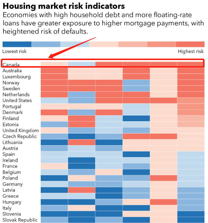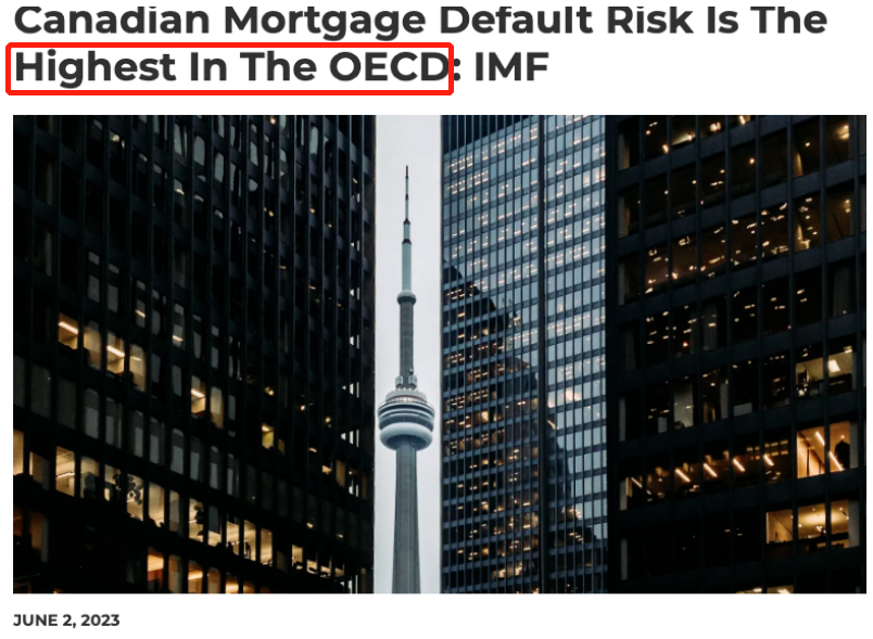 就在本月初,国际货币基金组织IMF的一份最新研究报告中警告,加拿大家庭的高债务、泡沫房价和浮动利率贷款等多种因素相结合,使加拿大成为世界上风险最高的发达经济体。(回顾:IMF警告:加拿大房贷违约风险全球最高)