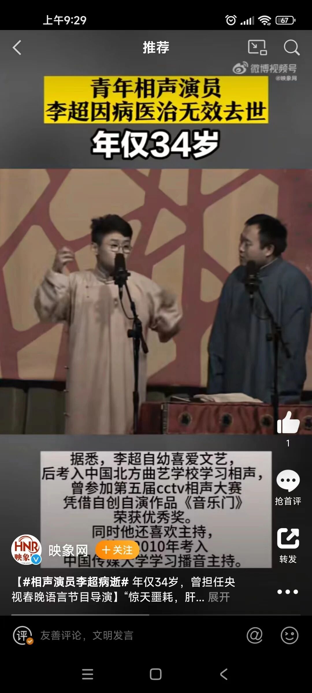 “惊天噩耗,肝肠寸断。 小超兄弟一路走好。” 6月19日中午, 相声演员苗阜在微信朋友圈 发布了青年相声演员李超 病逝的噩耗。