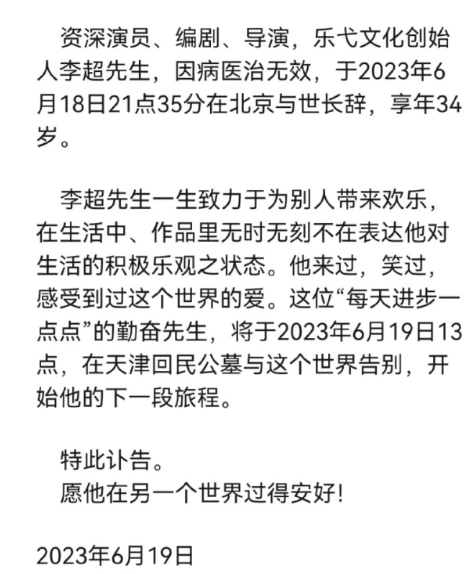 记者随后从李超创办的北京乐弋文化传媒有限公司采访获悉:李超先生因肺癌晚期医治无效,于2023年6月18日21点35分在北京去世,终年34岁。