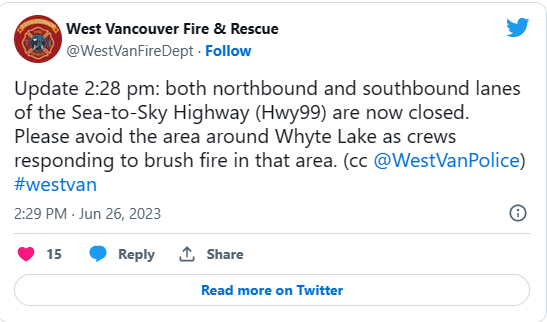 根据西温消防救援局的最新消息,怀特湖附近突发新的山火,目前已经“失控”!海天高速公路在马蹄湾的双向路段被紧急关闭,多架直升机出动灭火!