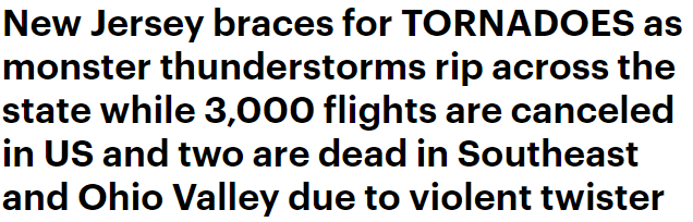 周一下午,邻国美国新泽西州的居民也被警告要做好应对潜在龙卷风的准备,因为引发多起龙卷风的恶劣天气系统已经在新泽西州登陆。