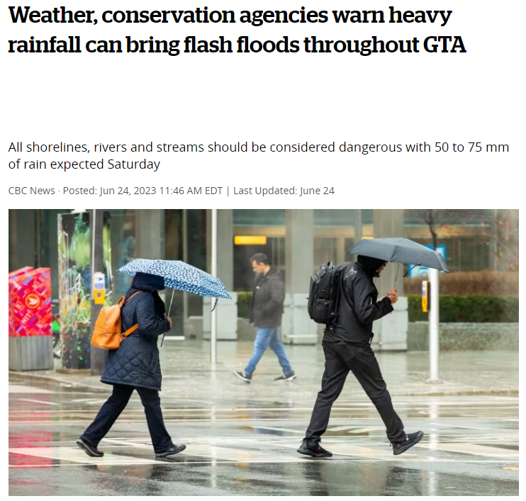 “大多伦多地区的所有海岸线、河流和溪流都应被认为是危险的,因为预期的降水将导致水位上升和水流加快。” 它警告居民在任何水体周围都要小心,让孩子和宠物远离水道,避开已经经历侵蚀和洪水的地区。