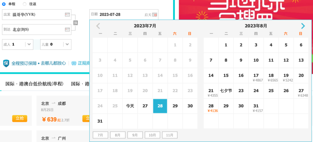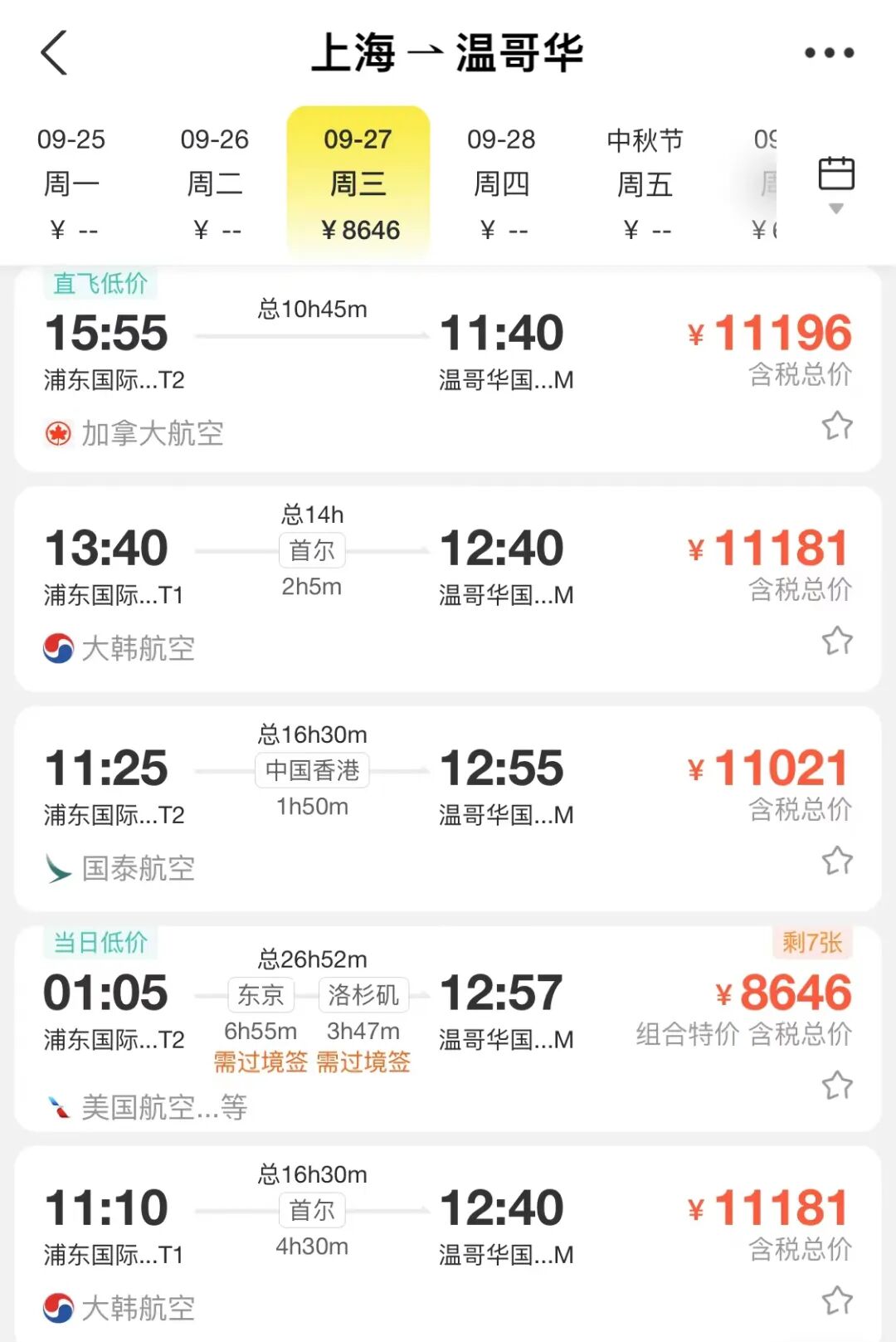 对于下半年的国际航班恢复情况,宋志勇局长预计,全年国际客运市场的复苏将呈现先慢后快、先周边后远程、先国内航司后外国航司的特点。 具体到不同的航空公司来说,东航预计其国际航班在三季度能够恢复到疫情前的60-70%,秋冬航季换季后能恢复到80%以上。 国际航线更多的国航相对更谨慎些,预计其国际航班在年底能恢复到疫情前的70%,全年预计整体恢复到2019年的50%-60%。 国际航线主要集中在周边地区的春秋航空,也预计今年年底恢复到2019年的80%左右,其中东南亚比东北亚恢复速度要快。 下半年国际航空客运市场将加快恢复,国际客运航班量有望恢复至疫情前60-65%。 这意味着,到今年年底,国际客运航班量仍无法“满血”恢复到疫情前的水平,而国际航班量的恢复速度,也将决定国际机票价格的下降速度。 小编随手搜了下下半年上海飞温哥华的航班,九月份加航直飞的票价还是在一万出头,基本上和现在差不多。 但8月28日,温哥华飞北京的出现最低票价已经是4136元人民币。这恐怕也是两年多来最便宜的回国机票了。 但到了11月,加航直飞票价直降四千多,才7000左右,如果是中转航班,那票价就更低了,基本上五千左右就能拿下。 大家有出国计划且不着急出发的,不妨可以观望下票价,毕竟能省一点是一点嘛!