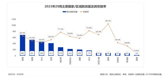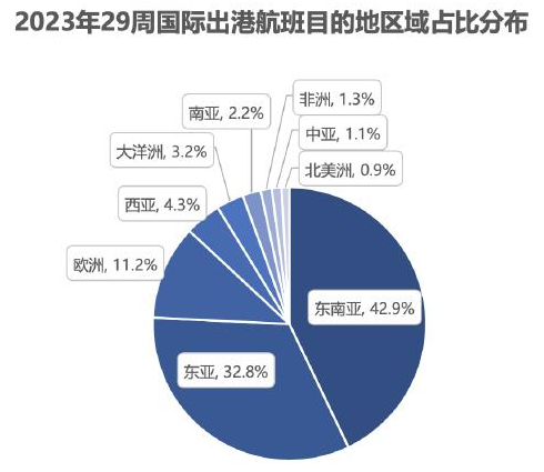 根据航班管家发布的最新一期民航运行周报,2023年第29周的国际航线航班量7361架次,环比上周上升1.5%,同比2019年下降52.8%;国际出港航班的目的地中,东南亚占比42.9%,居于区域首位。