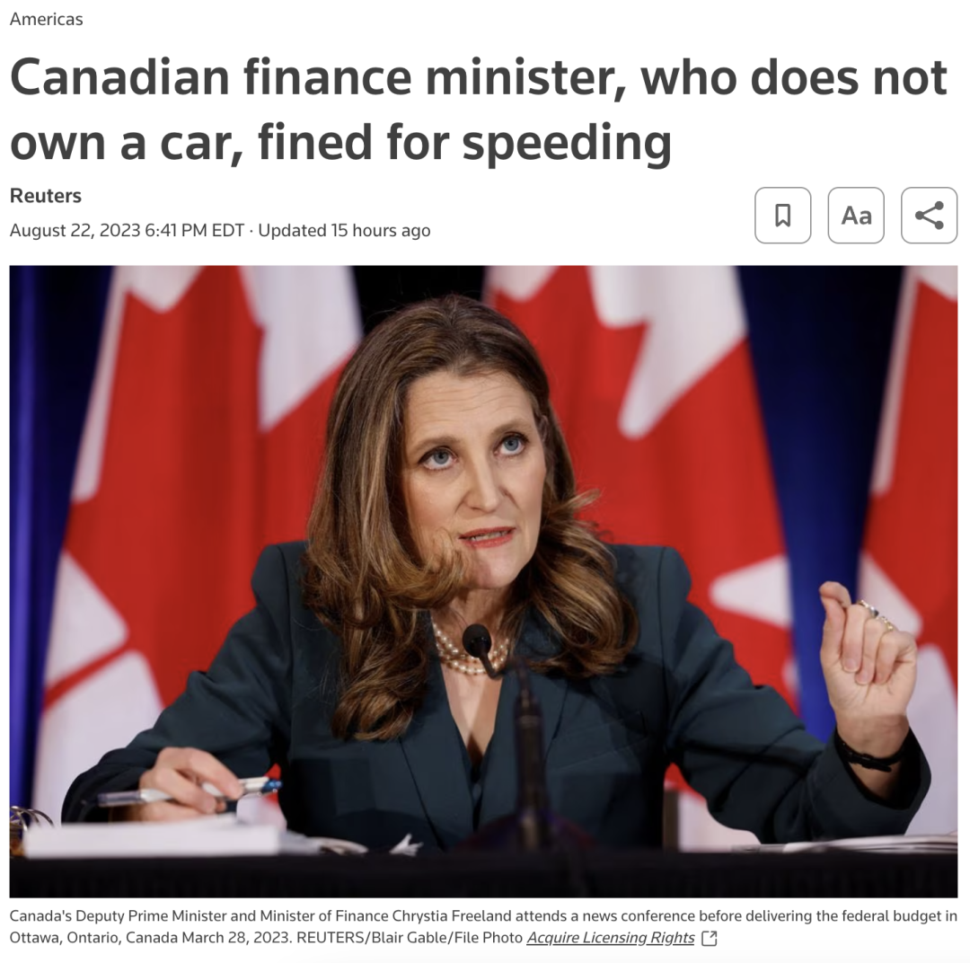 加拿大乌克兰裔副总理兼财政部长方慧兰(Chrystia Freeland)一度自诩为自行车爱好者,也曾表示自己没有车也不需要车。然而,最近她却被爆出在自己的家乡因为驾驶超速而被罚款$273加元。