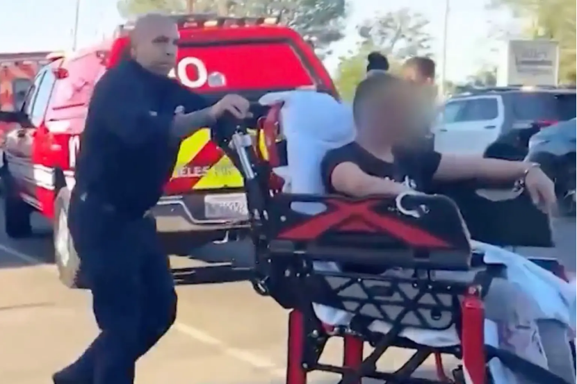 从现场画面可以看到,卡斯特拉诺斯被警方带走时坐在轮椅上,双手被束缚,身上疑似有割伤痕迹