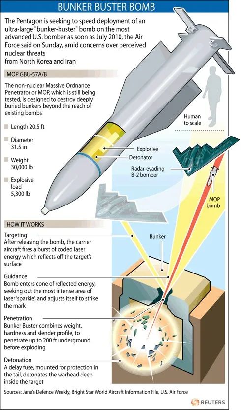 以色列急切盼望美军能加入战争,轰炸伊朗位于山体之下的福尔多铀浓缩设施,该设施建在库姆市东北约32公里处的一座山下的隧道群内,深度估计约为地表以下半英里。常规武器根本无法摧毁,据传只有美军的GBU-57A/B“巨型钻地炸弹”(MOP)才能击穿并摧毁地下核设施,而GBU-57A/B“巨型钻地炸弹”通常由B-2隐形轰炸机携带。