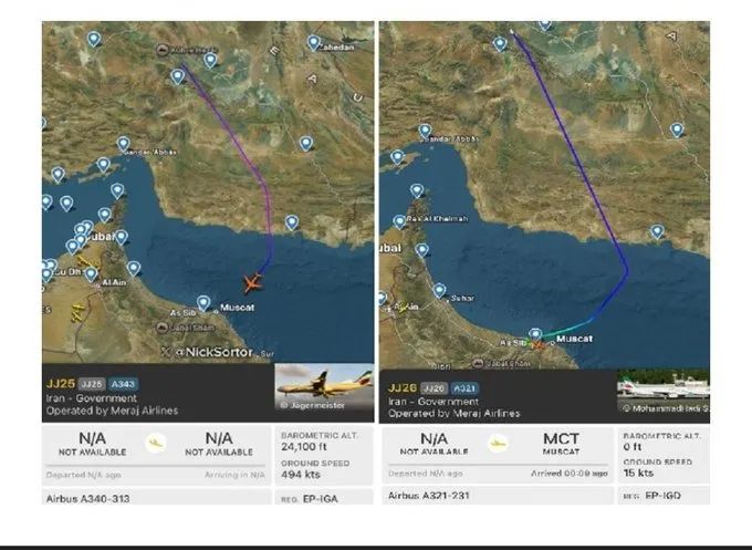 半岛电视台核实的飞行数据显示,两架伊朗政府飞机和一架伊朗私营梅拉杰航空公司的飞机降落在马斯喀特。