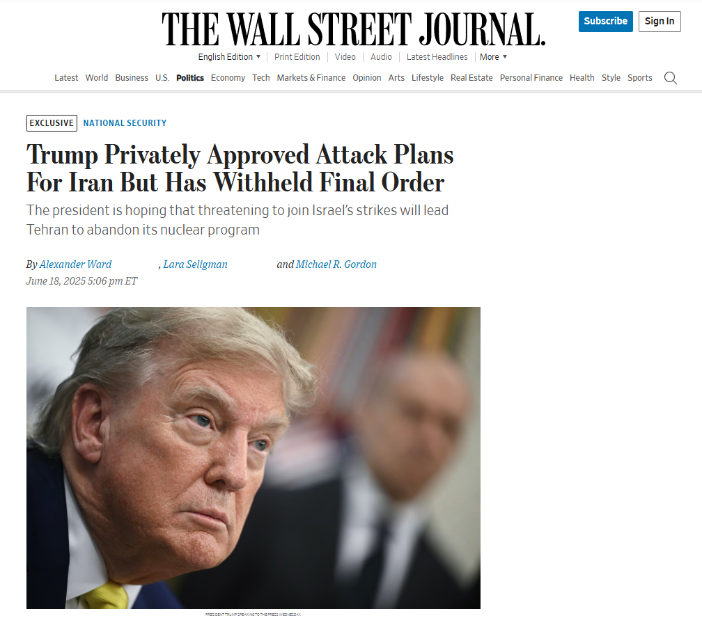 据《华尔街日报》最新报道,美国总统川普已经批准了一项对伊朗的作战计划,但出于外交和战略考量,尚未下达最终执行命令。