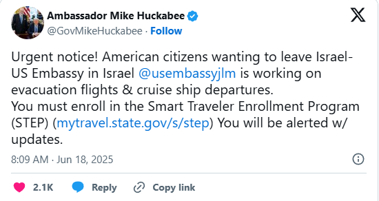 美国驻以色列大使迈克·赫卡比在社交媒体 X 宣布,大使馆正在为美国公民安排撤离飞机和船只。目前尚不清楚有多少外交官和家属搭乘该航班离开。