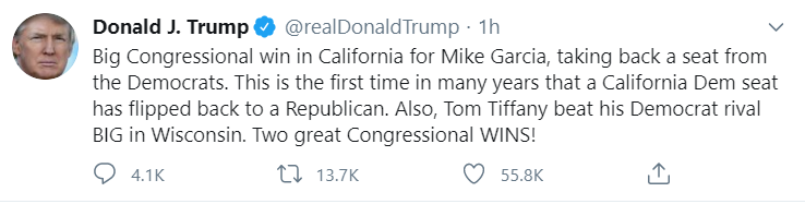 22年来首次!加州国会选区有望由蓝翻红,川普提前表祝贺