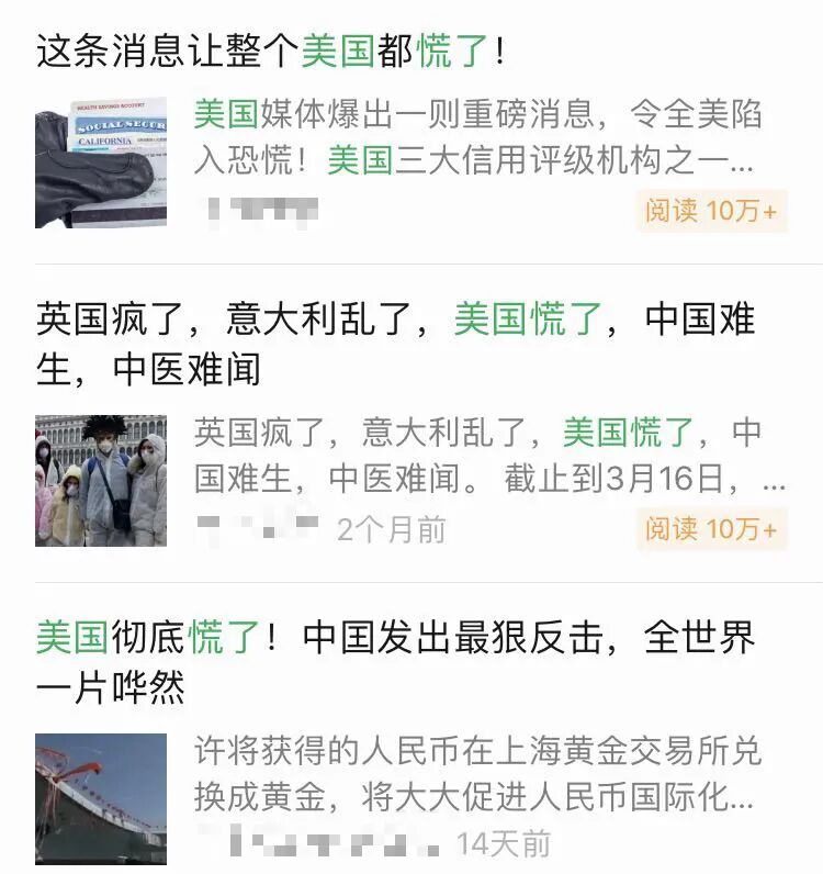 这些文章轻松过10万+,引来无数围观,甚至引来喝彩,骗得我们的亲戚、朋友、老乡信以为真。