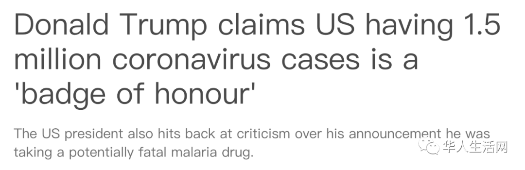 川普总统表示,美国确诊数量全球最多,证明进行的检测比别国多,可视为一种“荣誉徽章”(badge of honor)。