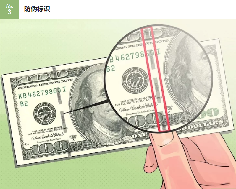 1.在灯下观察。除了$1和$2的钞票外,所有面值的钞票上都有一条由上至下的安全线。 安全线垂直嵌于美联储盖章右边的空白位置(而非印在钞票上)。在光照情况下,真钞的安全线应该很容易就能看见。 安全线内因有钞票面值和“USA”的字样,$10和$20的钞票面值以字母形式拼写,而$5、$50、$100的面值则以数字形式印刷。每种面额的安全线的位置都不一样,防止造假者漂白低面额纸币,印上高面额图案。 安全线上的字样在钞票的正反面都有。安全线只有在光照情况下才能看到。