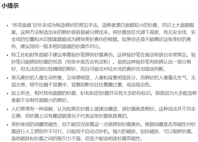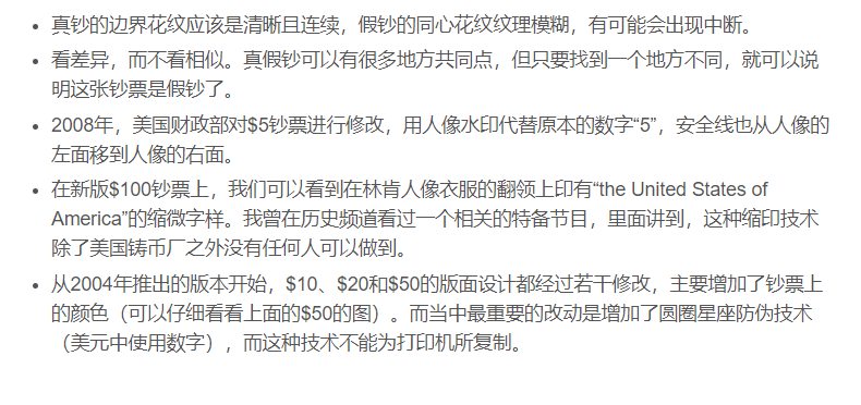 2.观察边界。根据特工处官员描述,美元真钞的边界花纹应该“清晰连续”。