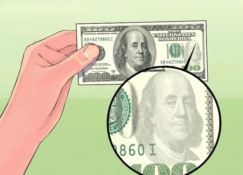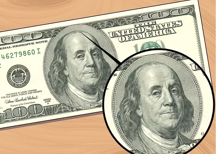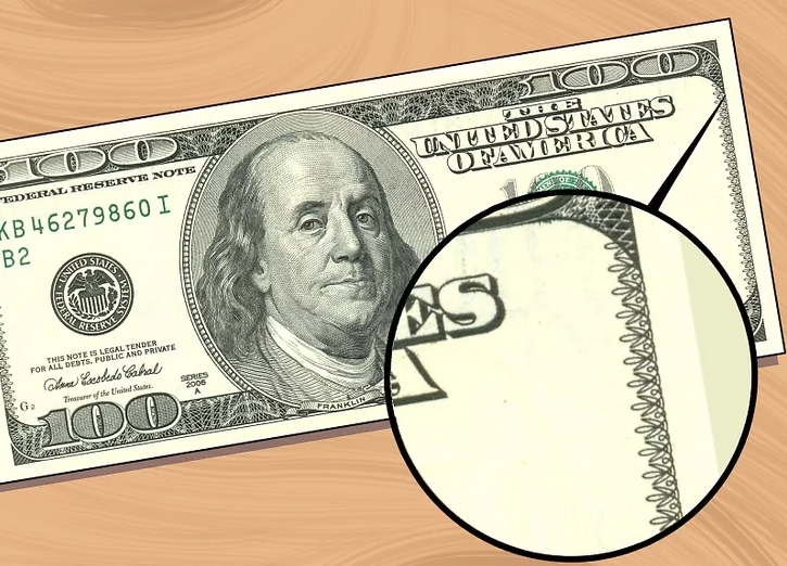 3.观察人像。仔细观察,假钞上的人物形象与真钞有明显不同。 假钞上的人像往往目光呆滞,轮廓模糊,缺乏层次。而真钞上的人像细节清晰,层次丰富。 美元真钞的人像立体感强,活灵活现。而假钞上的人像则与背景融为一体。 用放大镜观察人像的镜框。框内应有多个“THE UNITED STATES OF AMERICA”的字样包围人像,用肉眼看就像是一条实线。用普通办公室打印机就很难做出这种效果,因为这是一个极其细微的细节,而且字体太小,难以印刷。