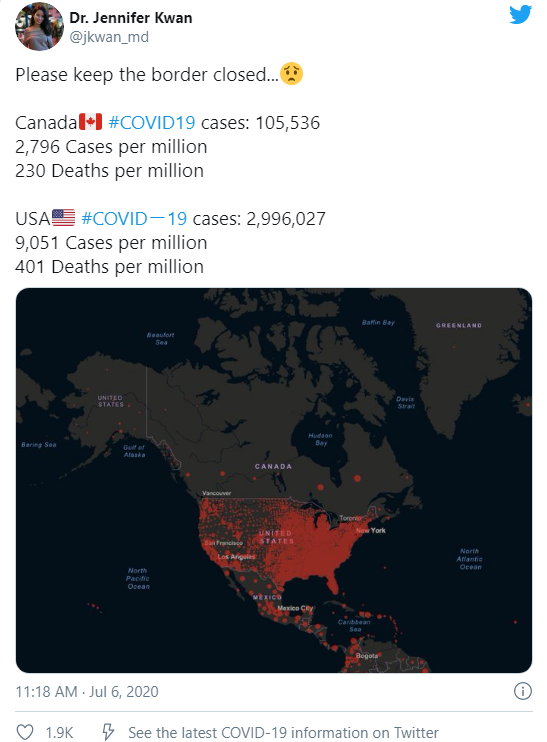 在抗击新冠疫情方面,加拿大与美国已经形成了巨大的反差,约翰霍普斯金大学的一张地图让大家一眼看清这种反差有多么的惊人,以致于传染病专家称,重新开放美加边境的想法让他感到“恐惧”。 图源:Johns Hopkins University 目前,加拿大的新冠病例继续下降,而美国的病例呈上升趋势。传染病专家Dr. Abdu Sharkawy说,加拿大与美国的边境将关闭至7月21日,但不久之后对非必要旅行重新开放,可能会导致病例回升。他说:“一想到任何放宽限制的可能性都会使更多人在美加之间出行,这让我感到恐惧。”他补充说,美国可能在下周达到日新增感染10万例。“与加拿大过去三四个月相比,美国的数字简直令人难以置信,是天文数字。”他说,追踪全球COVID-19感染病例的地图清楚地描绘出一个国家如何成功或失败地管理大流行。尽管这张地图上美国的数据更本地化,使其显示出更多的红点,但与加拿大相比,南边的病例仍然多得多。图源:Twitter Sharkawy说:“世界上没有任何其他地方在大流行控制方面,两个相邻的国家处于这种极端相反的境地。这是一个非常奇怪的现象。”截止目前,加拿大每百万人中有2796例COVID-19病例,而在美国,这一数字要高得多,为每百万9051人。美国的病例已接近300万大关,而加拿大则超过106,000例。Sharkawy说:“如果环顾世界其他已经成功拉平曲线的国家,许多病例回升的情况是由于放宽了旅行限制直接导致的。”“边境管制和旅行限制是确保特定地理区域安全的一个非常关键的要素。”“美加边境是世界上最长的不设防边界,我们绝对不能在COVID-19感染上,把它变成最长的未保护边界。”上月,安省省长福特已表示,过早重新开放边界可能引发第二波疫情。福特说:“我知道这是不可避免的……我不认为我们已经准备好了。”“你可以看到美国各州正在发生的事情:佛罗里达,德克萨斯,亚利桑那,加利福尼亚。我不想成为那些州。我想保护安省的人民。”“相信我,我爱美国人,不要误会,但是当他们的新冠病例激增时,我并不赞成开放边境。”自今年3月以来,因非必要理由入境加拿大的所有人都要隔离两周。这项命令已经延长至8月31日,并且可能进一步延长。在加拿大境内旅行Sharkawy说,他现在不会在加拿大公路上旅行,但开始计划探索省际旅行是非常合理的。“不是为了这样做而这样做,但是如果有人要拜访朋友或家人,并可能给他们带来极大的舒适和满足,那么我认为这样做的好处大于感染的理论风险。”
