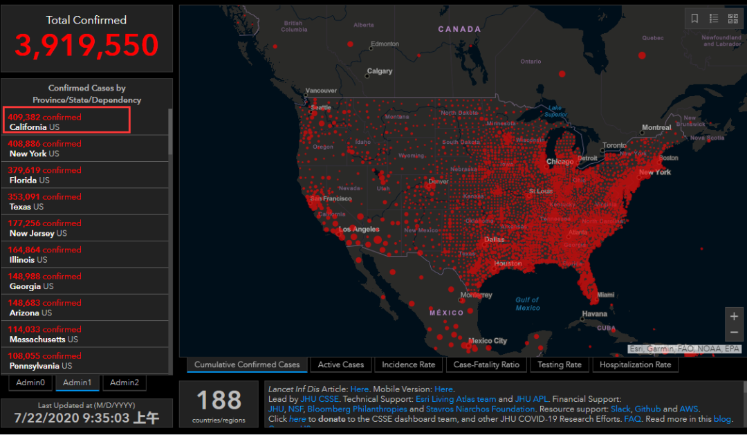 截至美国东部时间7月22日晚5时,全美共报告新冠肺炎确诊欲突破400+例,死亡140828+例。