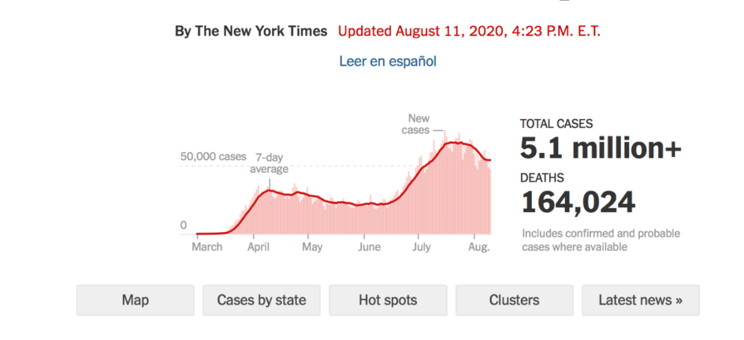根据《纽约时报》的数据库,截至周二下午,美国已有超过5140,300人感染冠状病毒,至少16.4万人死亡。