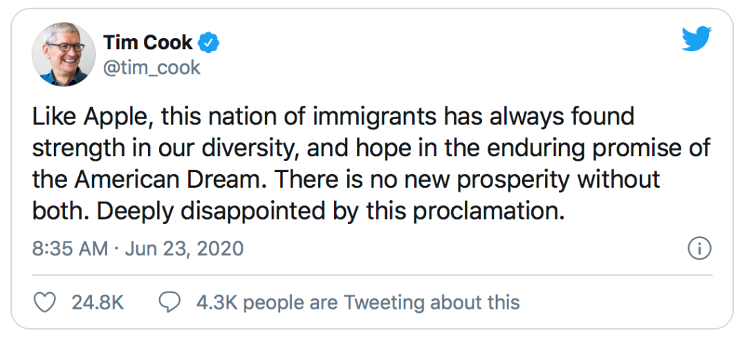 6月23日,库克在推特上写道:“像苹果公司一样,这个由移民组成的国家总是在我们的多样性中找到力量,在美国梦的持久承诺中找到希望。没有这两者,就不会有新的繁荣。”