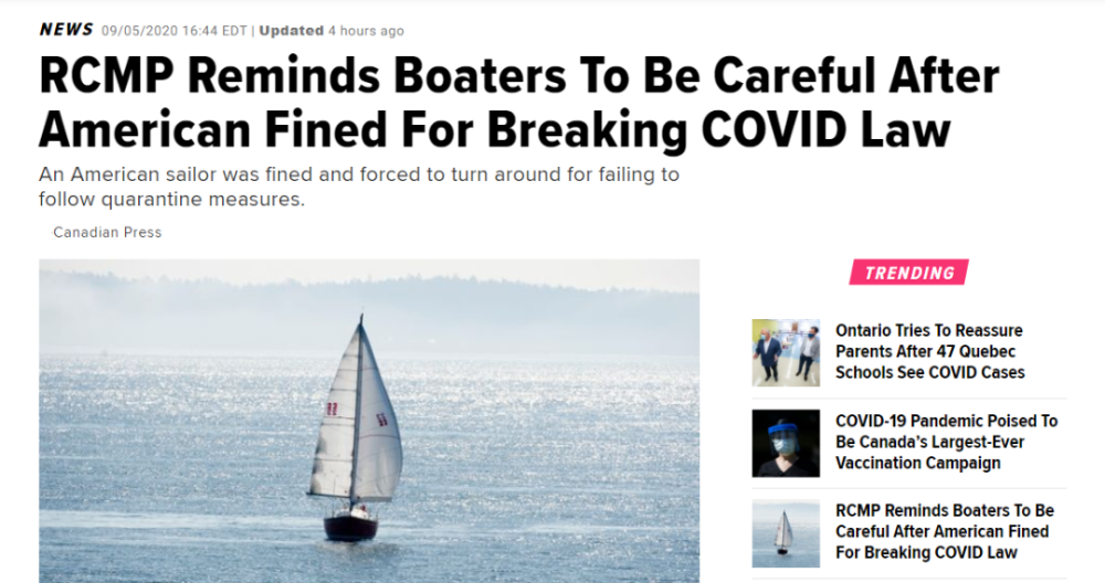 加拿大版的美国《海芬邮报》最近报道了一起案件,一名美国人无视加拿大的防疫法规而乘水进入加拿大。违规船只的所有者最终被罚款2,000加元,并于8月31日被加拿大驱逐出境。