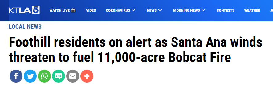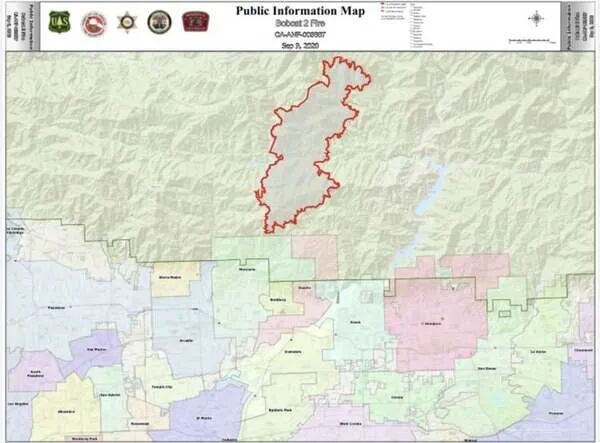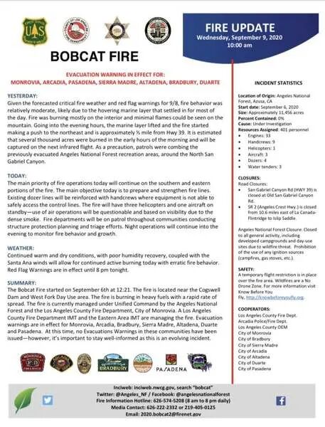 洛杉矶华人资讯网记者Johnson综合报道,由于担心周三的一场中等烈度的圣安娜季风(Santa Ana Wind)将“山猫大火(Bobcat Fire)”向南推向居民区,火场附近多个城市的警方都对本市市民发出了疏散令。