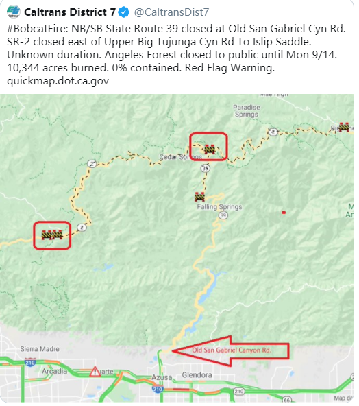 根据美国林业局的消息,洛杉矶国家森林公园将在9月14日之前停止对外开放。加州运输局在推特上表示,2号公路和39号公路的部分路段因火灾而关闭。