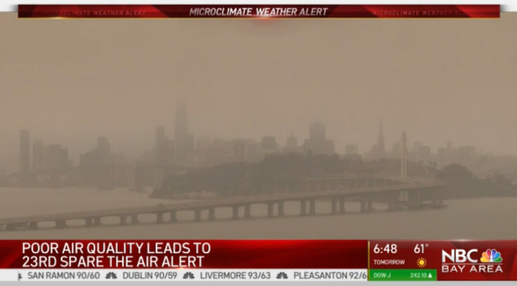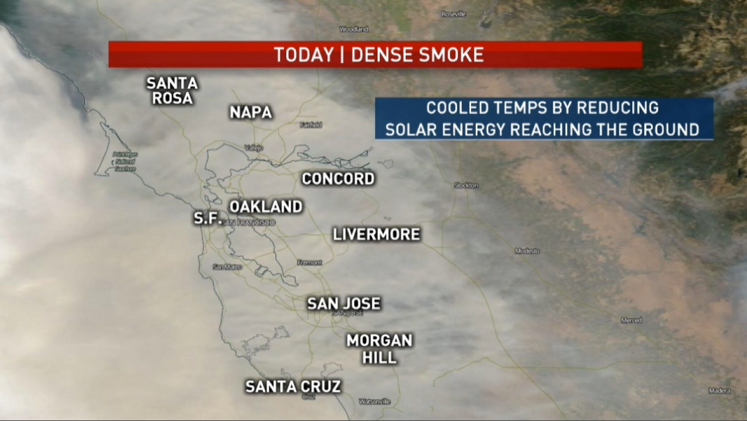 国家气象局预报员Roger Gass解释说,强风把湾区100多英里外的Mendocino县山火的烟雾吹到湾区,但由于强风让烟雾远离地面,飘到空中,所以闻不到烟味。但一旦风势减弱,烟雾下沉,烟味将变浓。